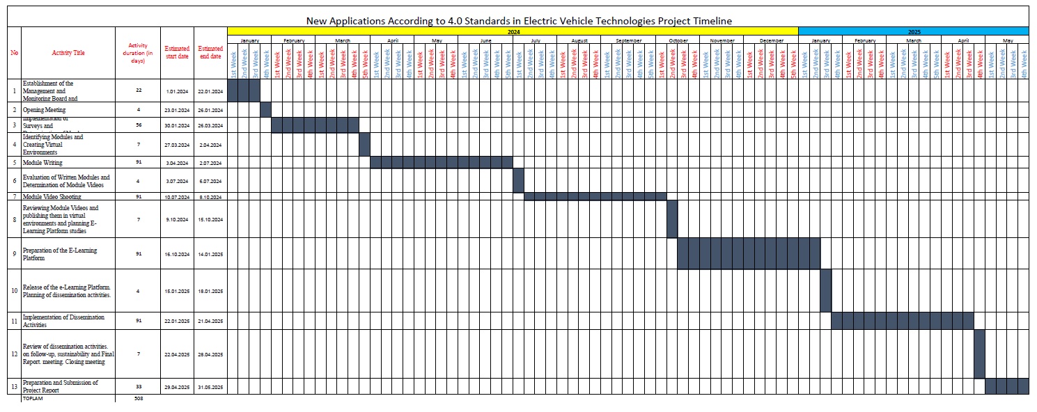 Elektrikli Araç Teknolojilerinde 4.0 Standartlarına Göre Yeni Uygulamalar Proje Zaman Çizelgesi